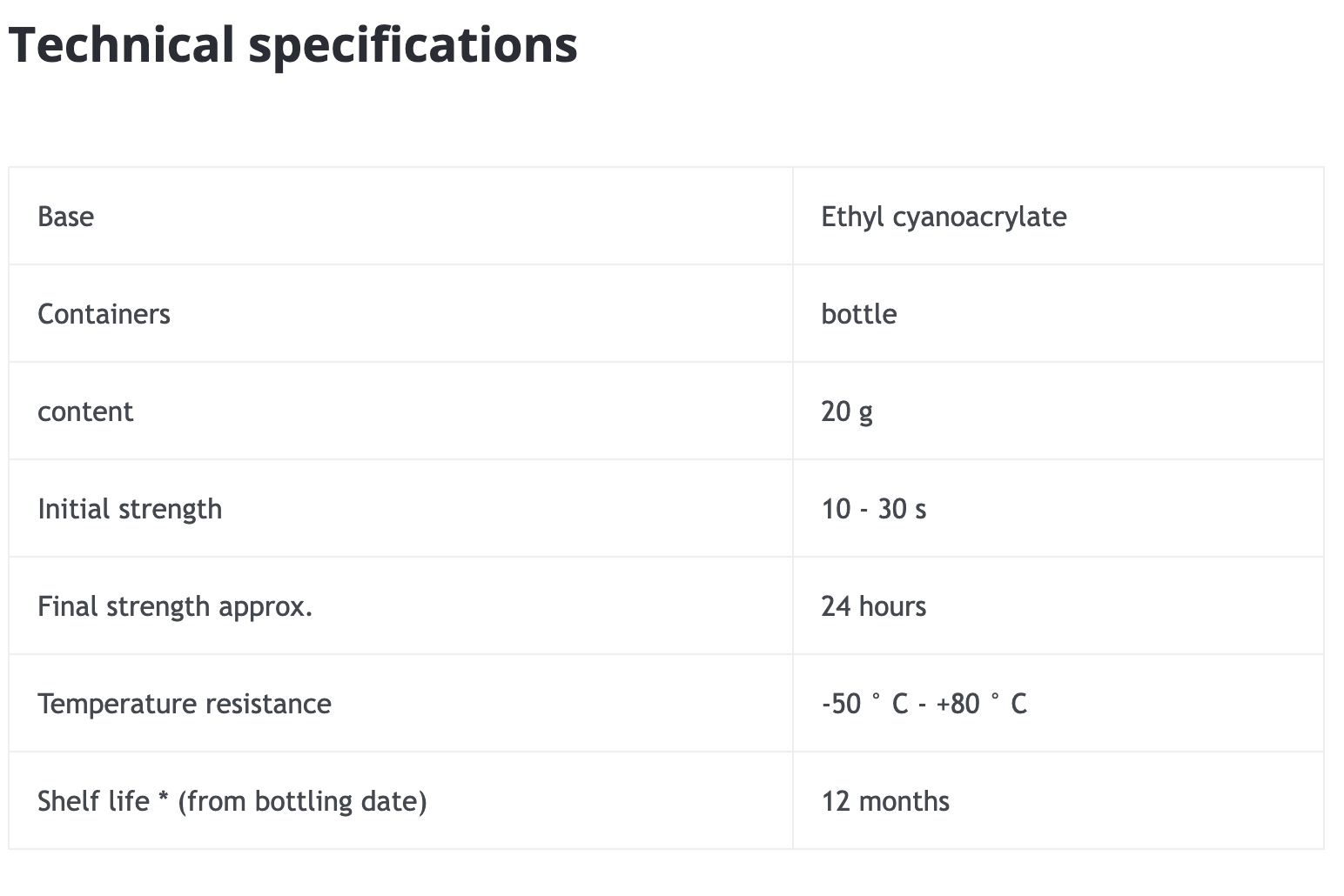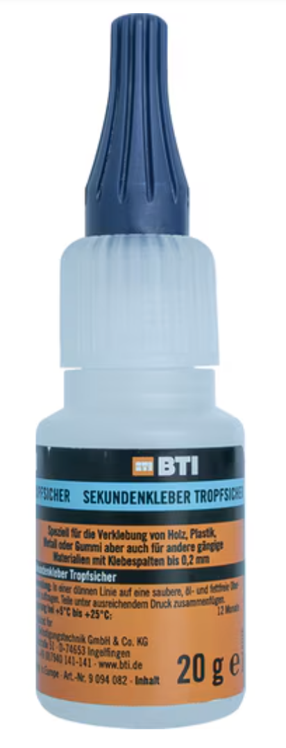 Les surfaces doivent être propres et exemptes de graisse. Appliquez la colle avec parcimonie, en un fin trait, sur une seule surface, puis pressez fermement les deux pièces l'une contre l'autre. La super-colle BTI polymérise à température ambiante et sous l'effet de la pression de contact et de l'humidité ambiante. Plus la couche de colle est fine, plus la polymérisation est rapide et plus l'adhérence est forte. La largeur des joints et la température ambiante influent également sur la vitesse de polymérisation. Ce produit ne convient pas au collage du PP, du PE, du PTFE ni du silicone.