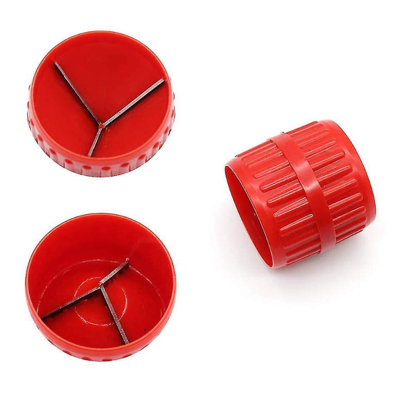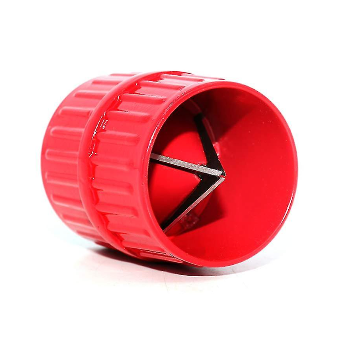 Outil d'ébavurage pour tuyaux en cuivre, aluminium, plastique et multicouches. Le corps est en aluminium peint, ce qui le rend résistant à la corrosion. Les lames sont en acier trempé.