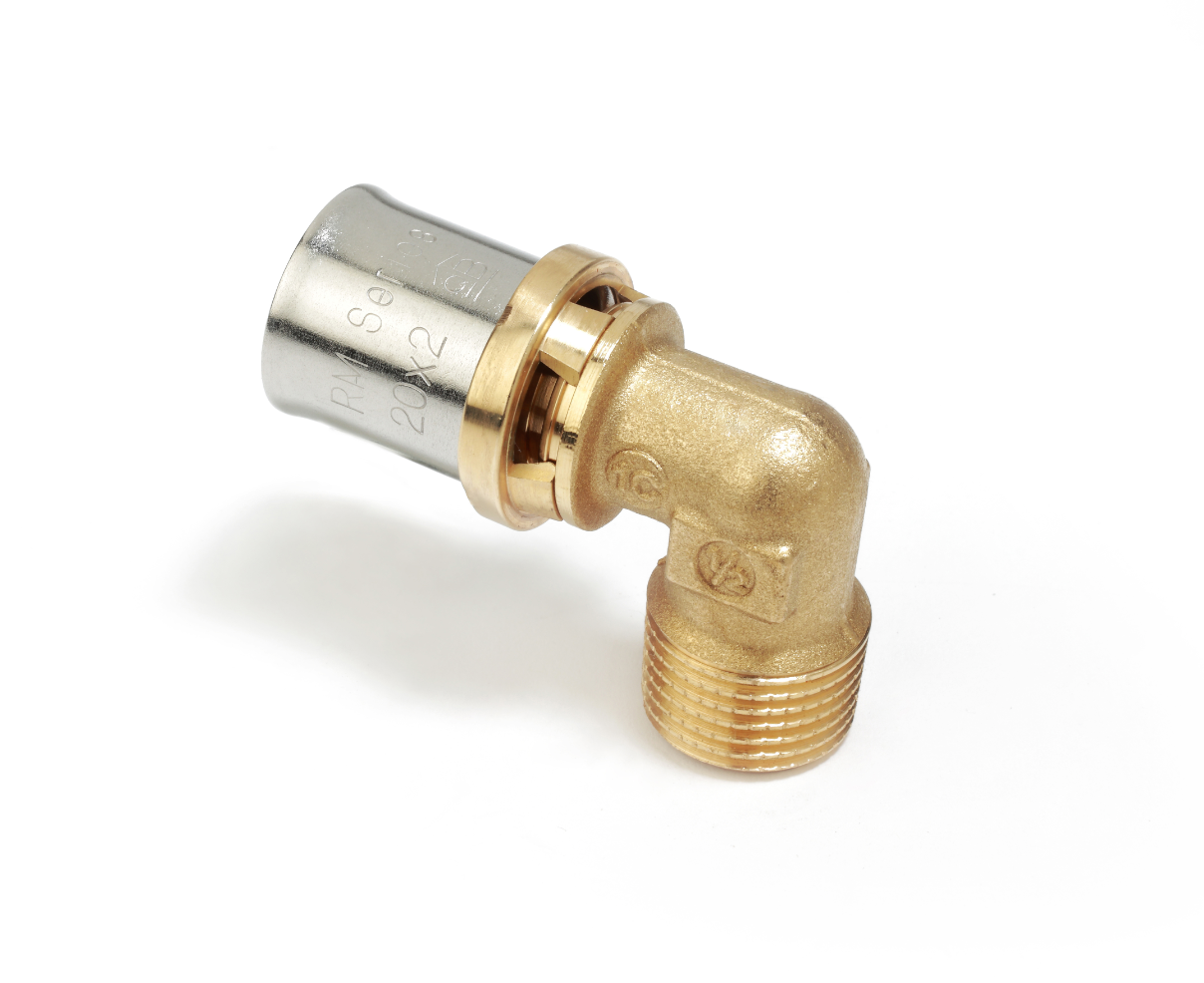 Fitting tal-minkeb ta' 90°, ħajta maskili u konnessjonijiet multitong għal pajpijiet tal-plastik jew multilayer. Għal sistemi tal-plumbing.