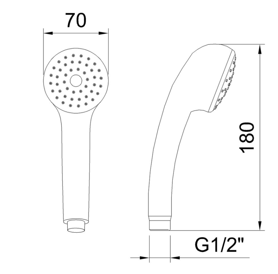 Doċċa tal-idejn b'funzjoni waħda (handset tad-doċċa) , b'dijametru tar-ras ta' Ø 70 mm u tul totali ta' madwar 180 mm , b'kostruzzjoni tal-plastik ABS b'finitura tal-kromju
