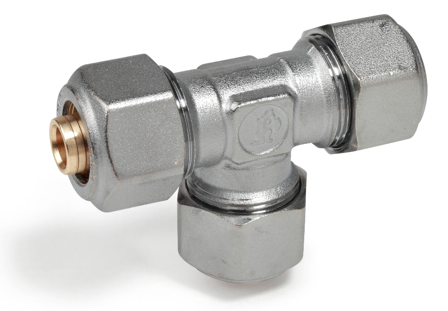 Tee fitting, chrome plated brass, plastic or multilayer pipes connections. For plumbing systems.