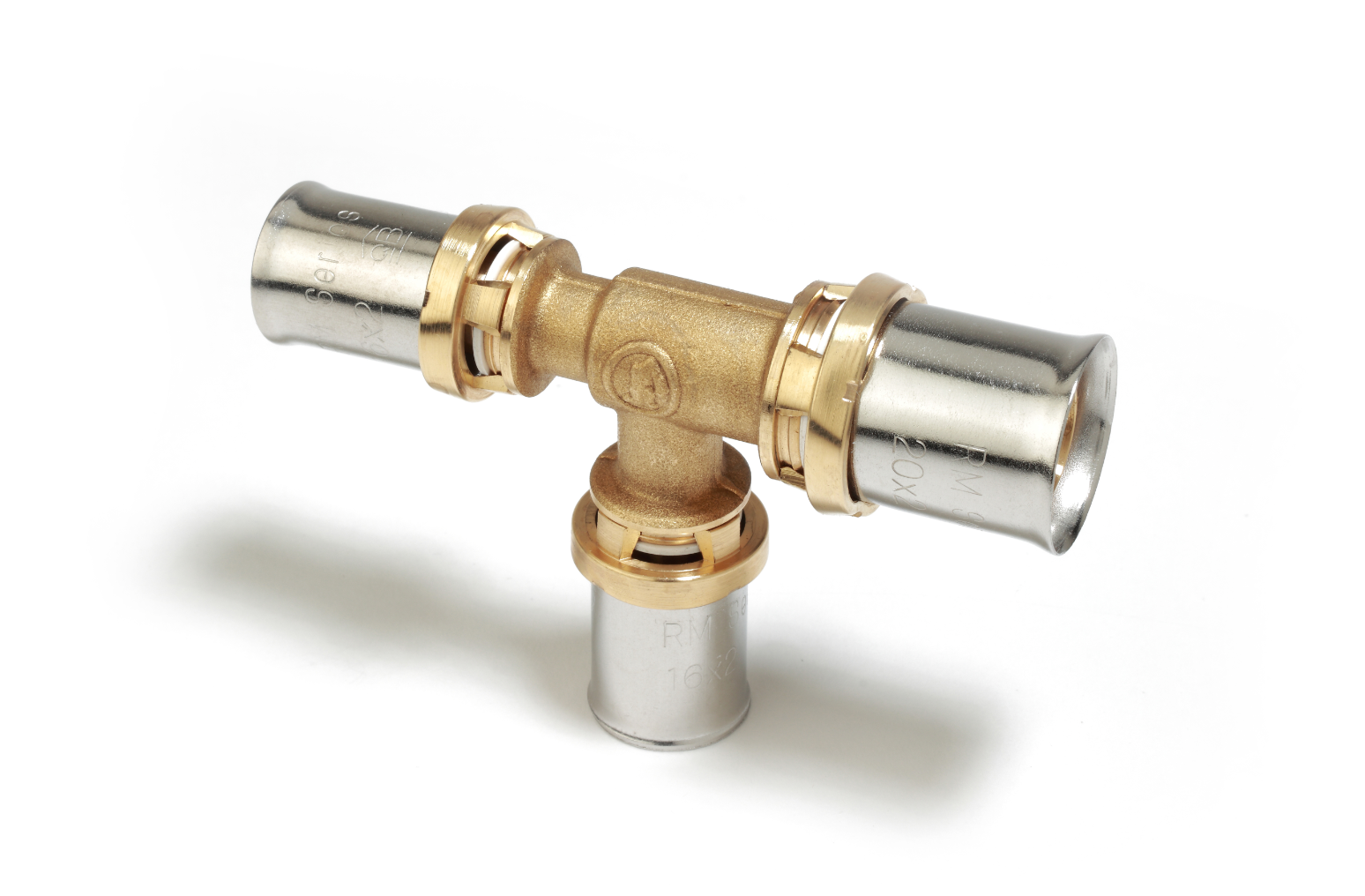 Reducer Tee fitting, multitong connections for plastic or multilayer pipes. For plumbing systems.